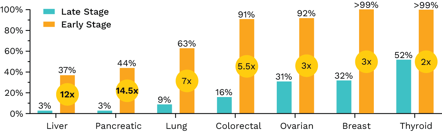 When cancer is caught late, treatment becomes more invasive, more expensive, and less effective. Survival rates plummet between Stage 1 and Stage 4 for almost every type of cancer.