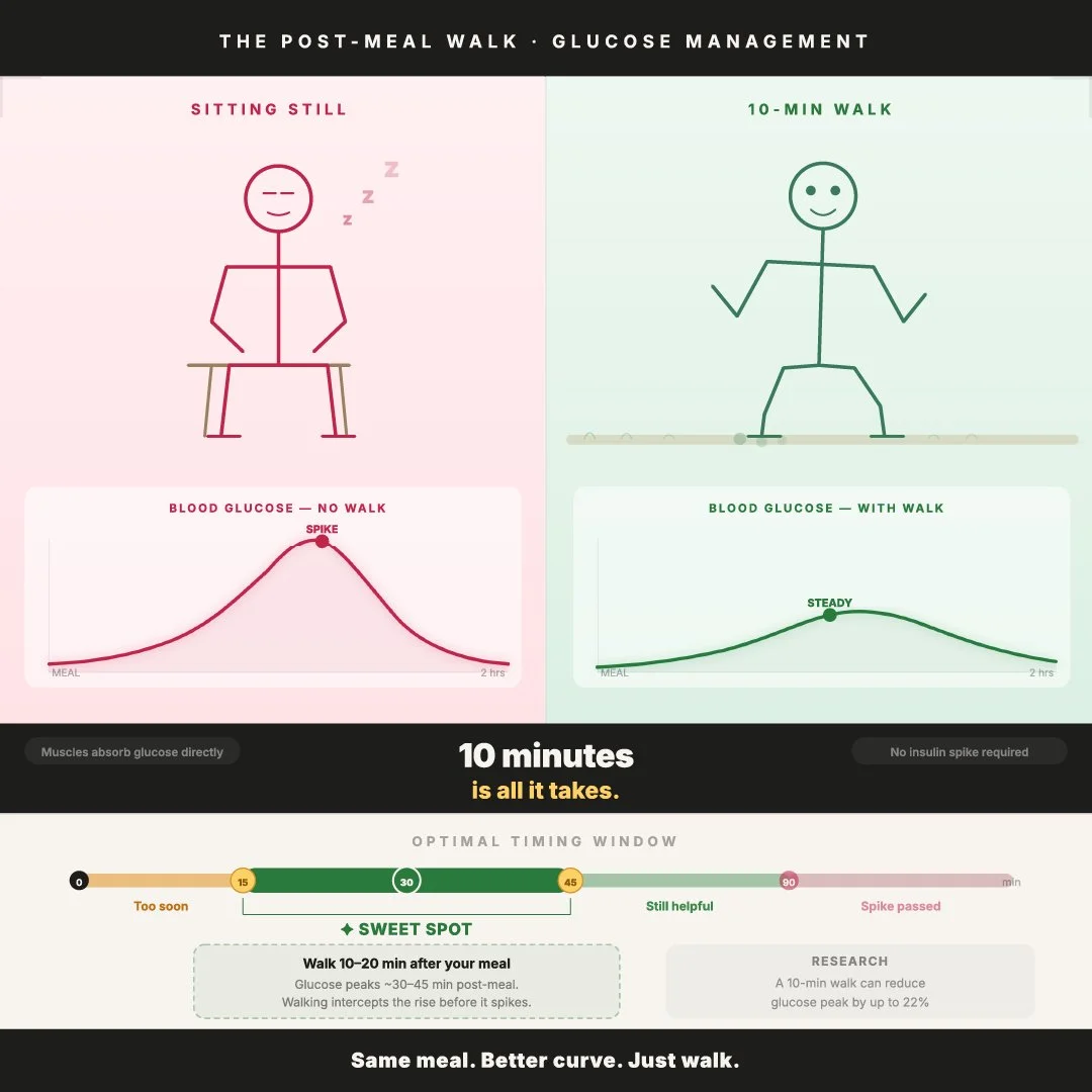 Several studies have shown that taking a walk after a meal can reduce the post-meal glucose spike by 15-30%. While this doesn’t mean a walk is a “free pass” to eat a huge amount of simple carbohydrates or refined sugars, it can be a useful way to “flatten the curve” of your blood sugar response.