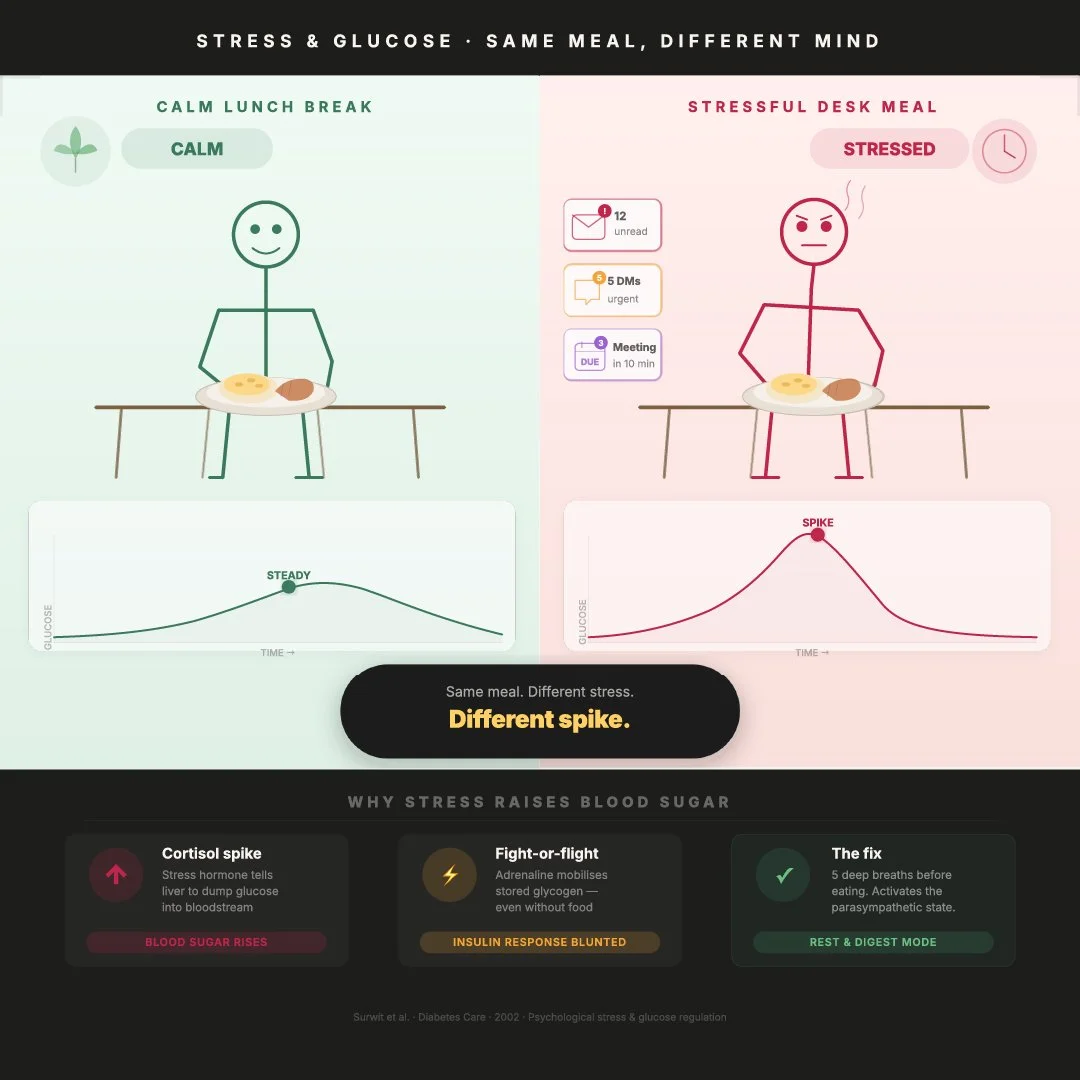 Because of this normal physiological response, blood glucose can sometimes rise during stress even if you haven’t eaten recently.